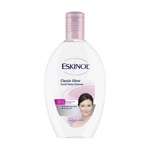 Eskinol Classic Glow Facial Deep Cleanser is a trusted skincare essential that removes deep-seated dirt, oil, and makeup residue to give you a clean, refreshed glow. Formulated with micro-cleanse anti-bacterial formula and natural skin vitamins, it helps prevent pimples, blackheads, and dullness while keeping your skin smooth and radiant. Used after washing your face, it deeply cleanses pores for a clearer, healthier complexion. Gentle yet effective, Eskinol Classic Glow Facial Deep Cleanser leaves your skin feeling cool, refreshed, and naturally glowing every day.