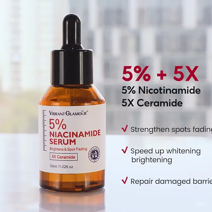 The Vibrant Glamour 5% Niacinamide Serum brightens skin, evens tone, controls oil, reduces acne marks and dark spots, and strengthens the skin barrier. It also provides soothing and moisturizing benefits, making it suitable for all skin types, including those with redness, sensitivity, dullness, or acne.